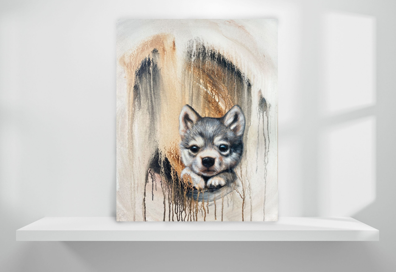 Baby Wolf on originaalimaalaus sudenpennusta, joka katsoo haikeana abstraktin sateen keskeltä. Teos yhdistää eläinaiheen ja modernin ilmaisun, luoden herkän ja tunteikkaan tunnelman.